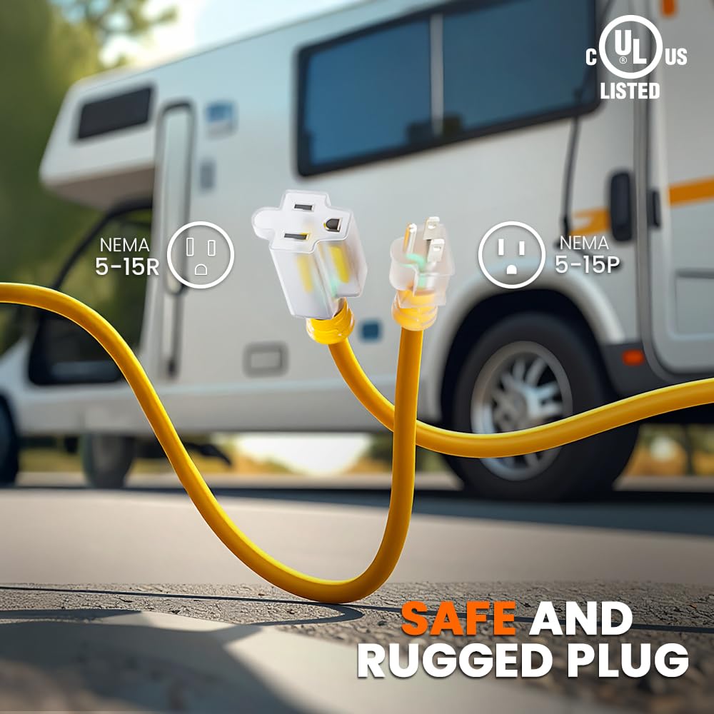 - HEAVY DUTY 12/3 GAUGE wire, 15 amp, 125 volt, 1875 watt, 5-15P to 5-15R Lighted Standard House Plug Connector Socket