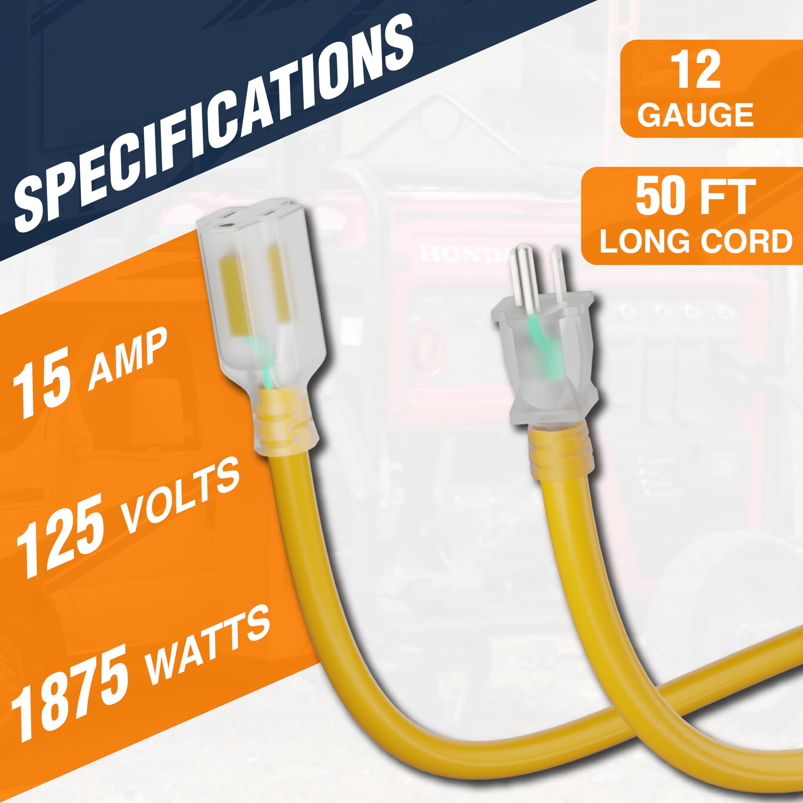 50 Foot Contractor Grade Outdoor Extension Cord with Lighted Power Outlet End by Journeyman-Pro 12/3 SJTW Yellow Cable with 3 Prong Grounded Plug 15 AMP UL Listed 50'FT (50FT Yellow)
