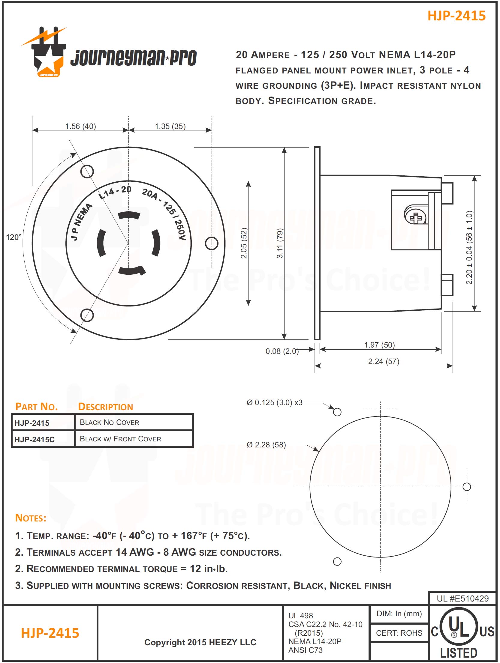 Journeyman-Pro 2415, NEMA L14-20 Flanged Inlet Generator Plug, 20A 125/250 Volt, Locking Receptacle Socket, Black Industrial Grade, Grounding 5000 Watts (with Waterproof Cover)—