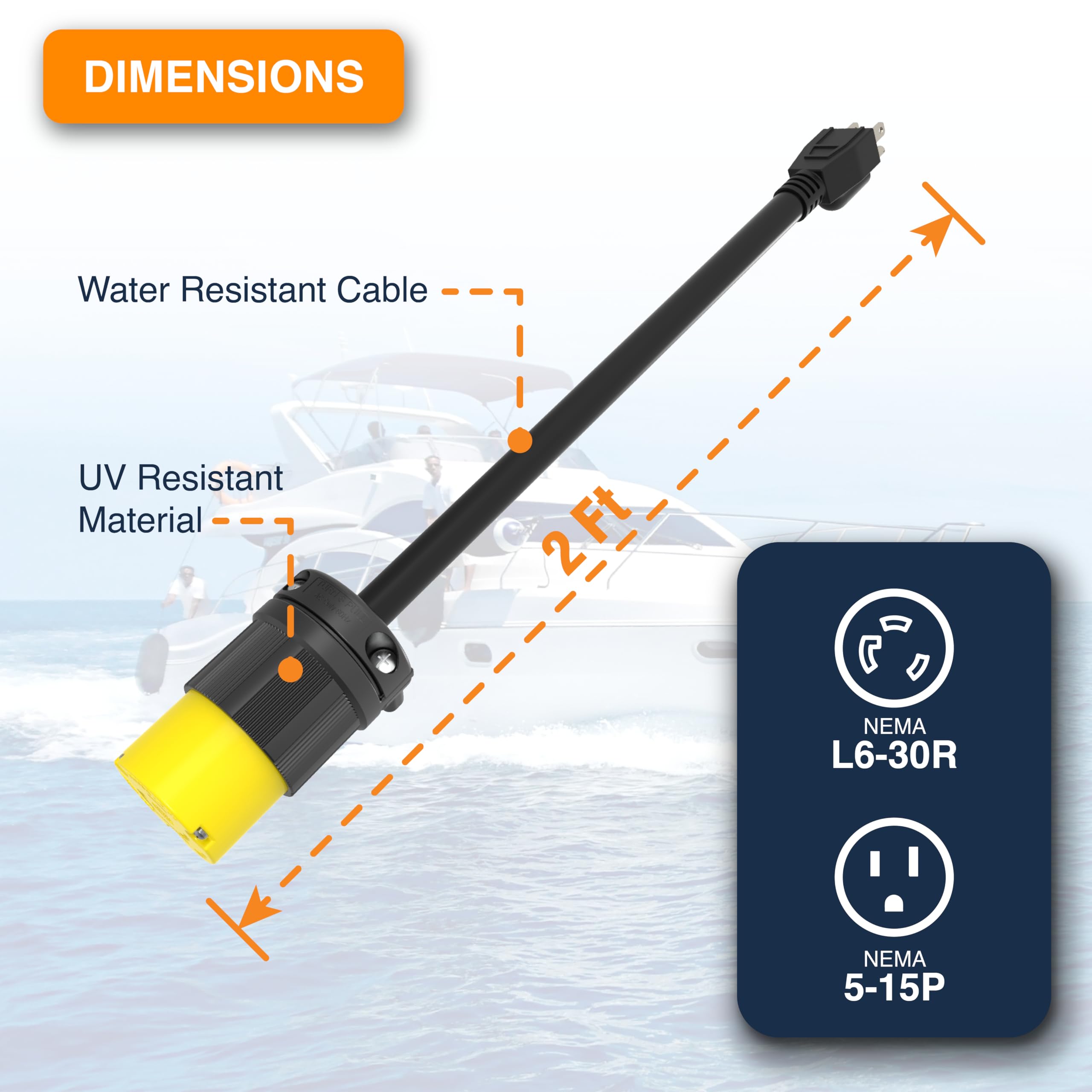 - Output Connector: NEMA L6-30R (Female), Twist Locking L630C - 220v to 250V, 30A (Maximum draw current at 15 Amps)